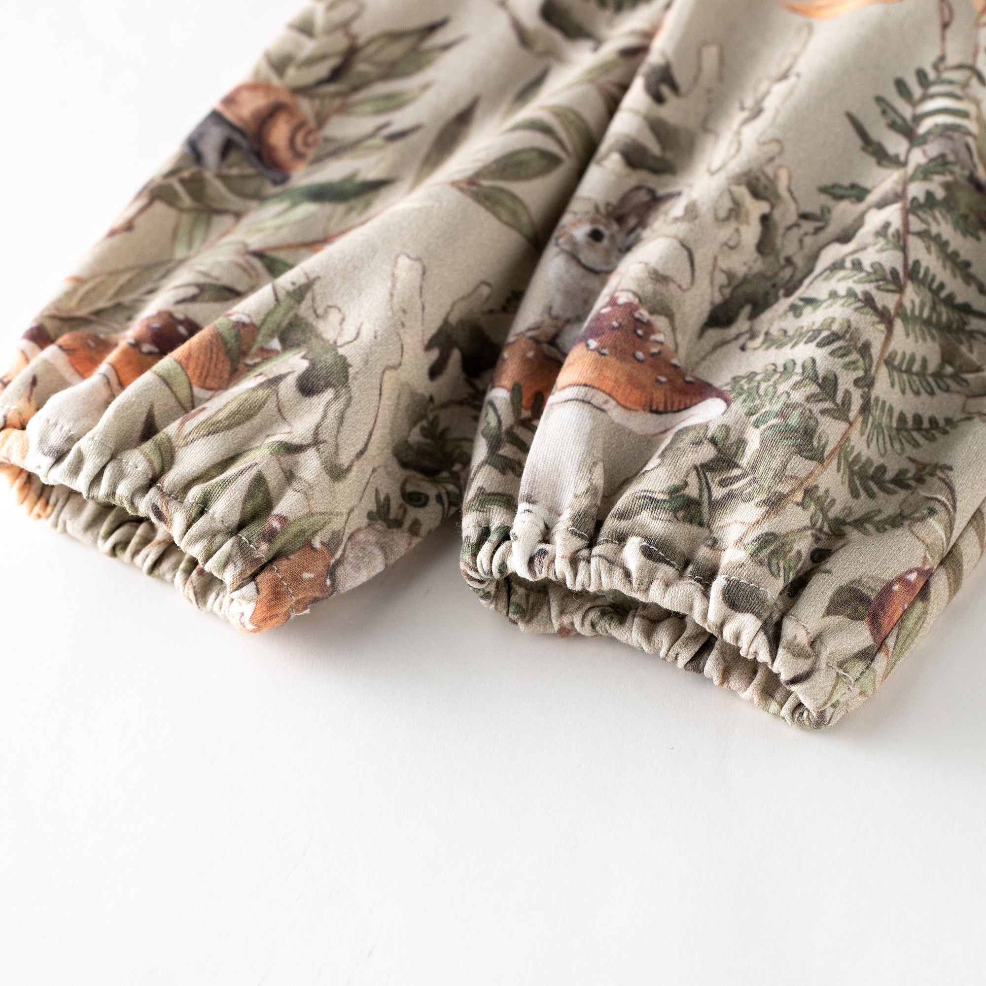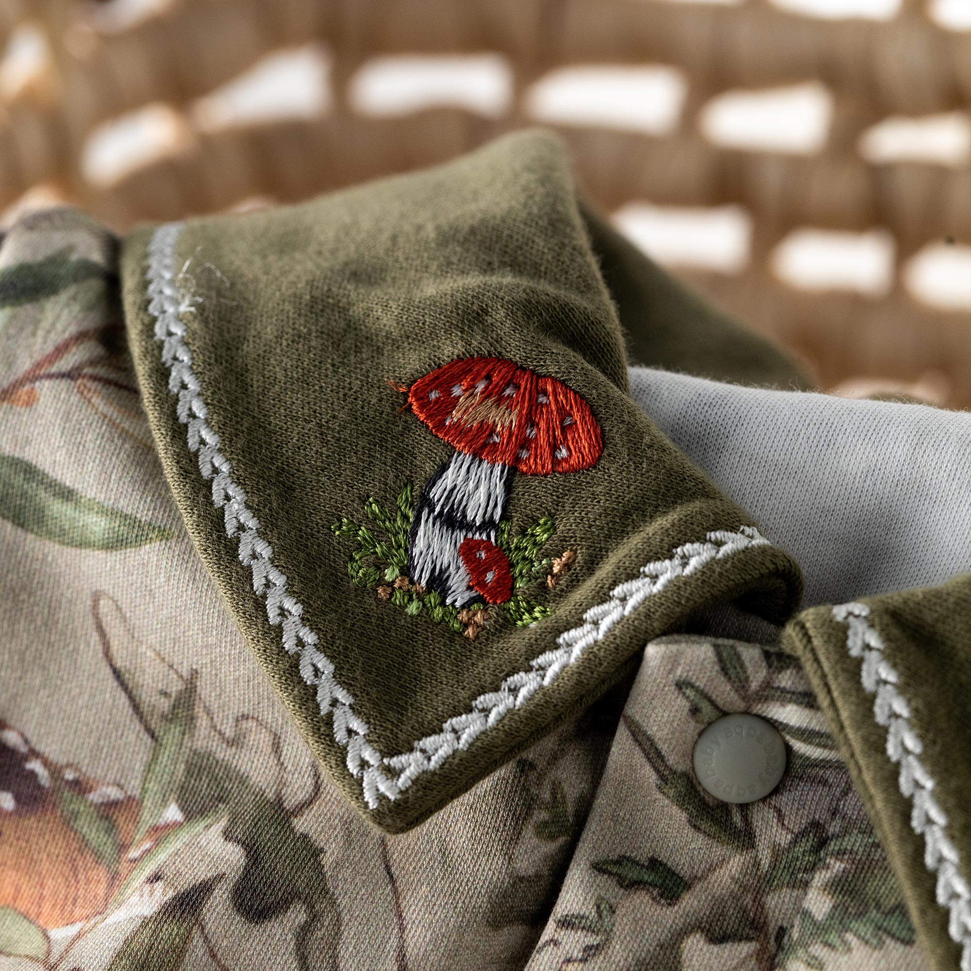Baby Romper – Forest Mushroom Print with Embroidered Collar | Lightweight Snap Jumpsuit for Easy Diaper Change