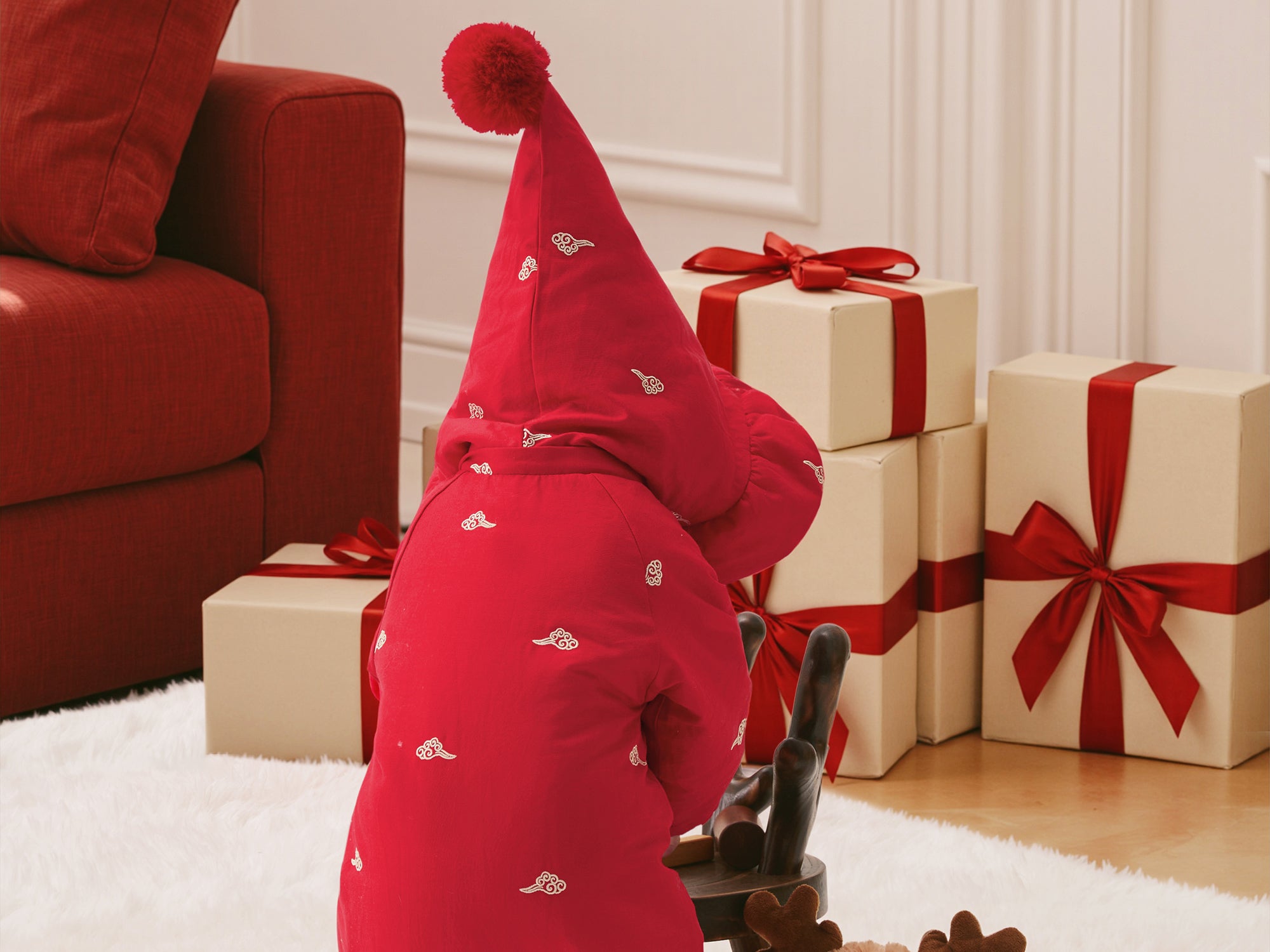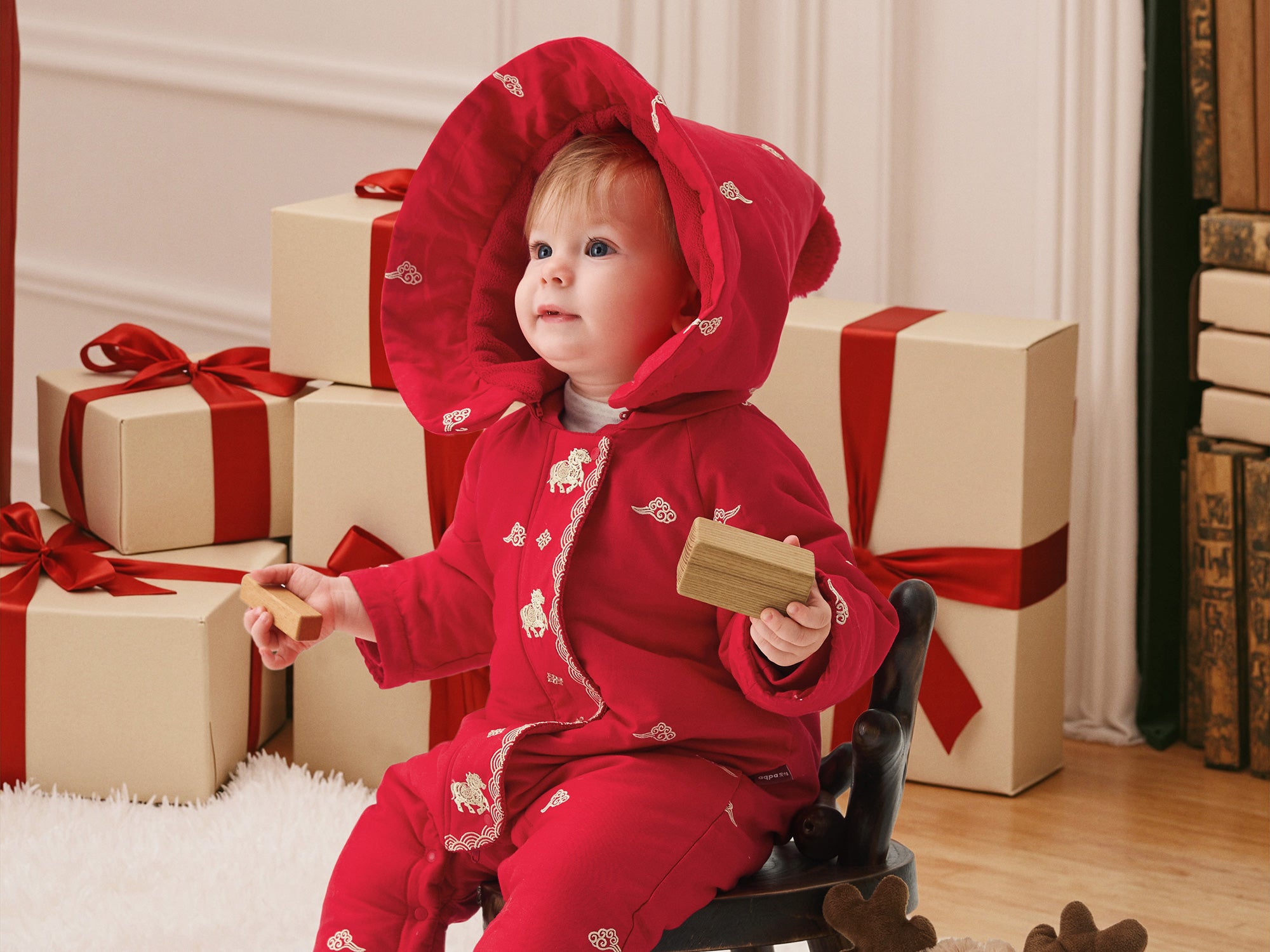 Soft Cotton Baby Romper in Festive Red | Cozy Fleece-Lined One-Piece for Cool Weather (0°C–15°C)