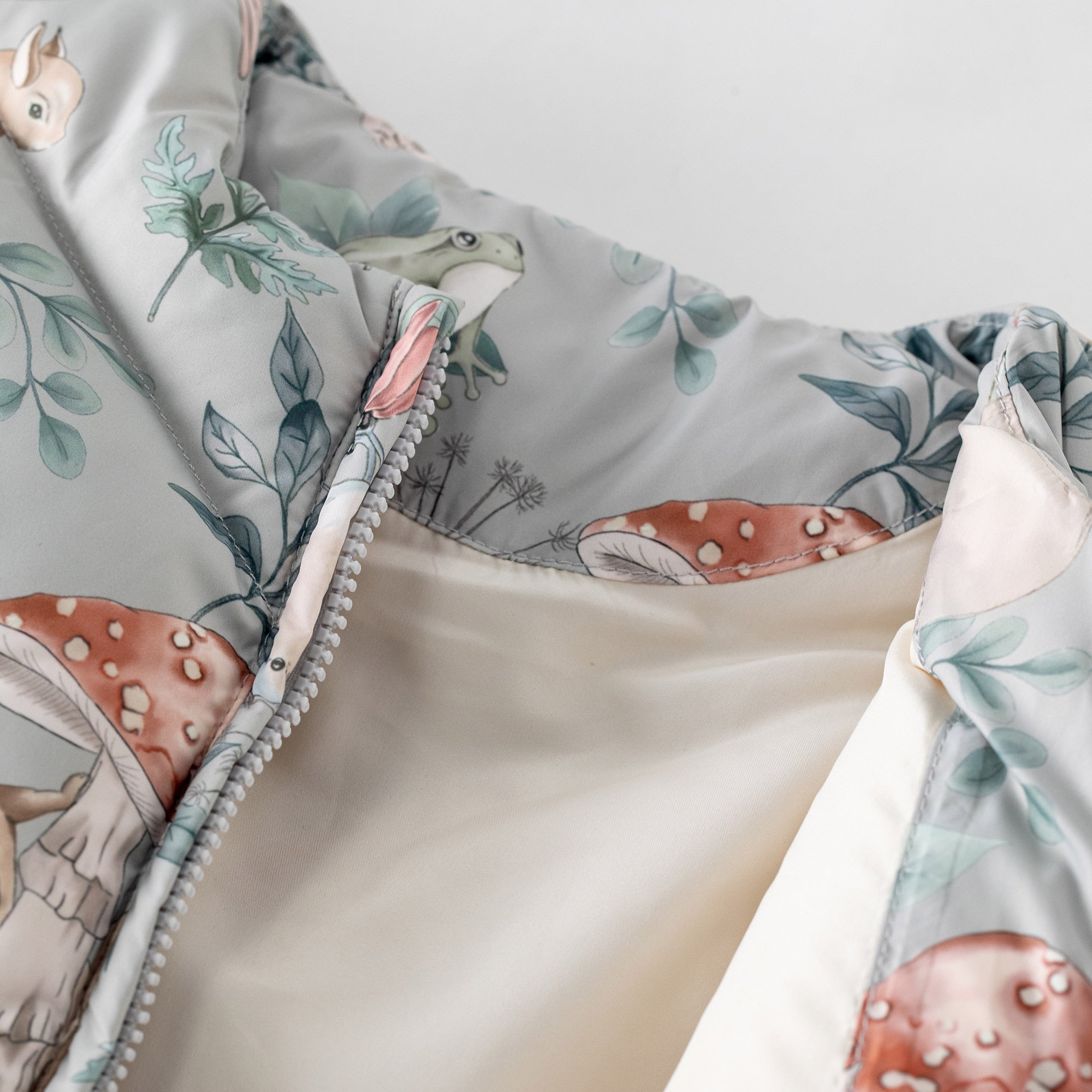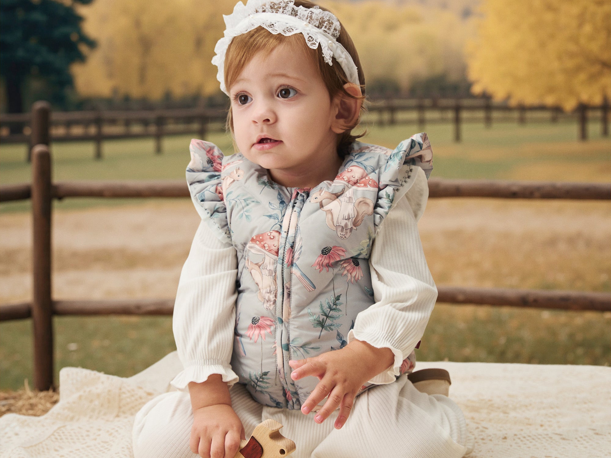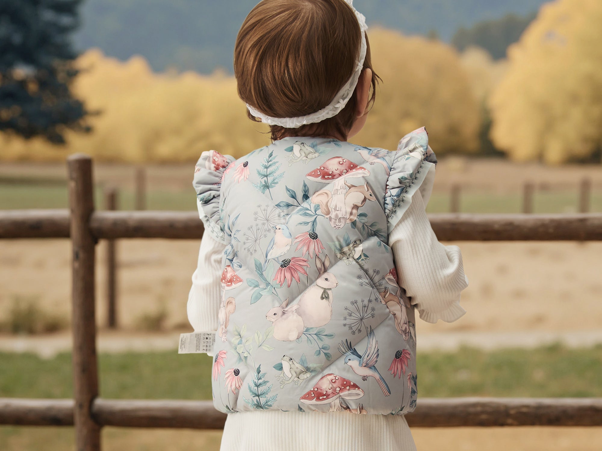 Lightweight Down Baby Vest with Floral Woodland Print | Cozy Layering Piece for Cool Weather (0°C–10°C)